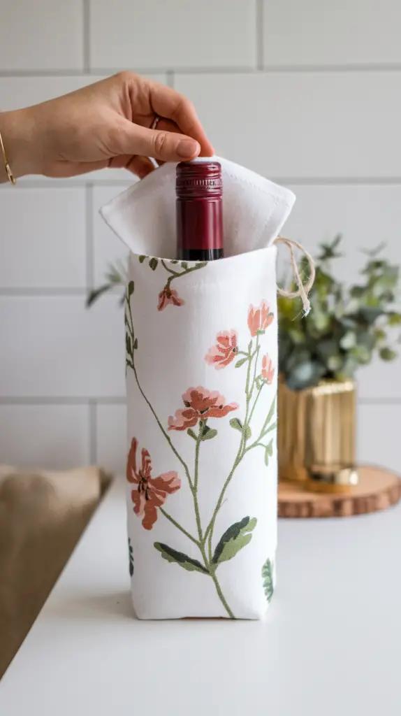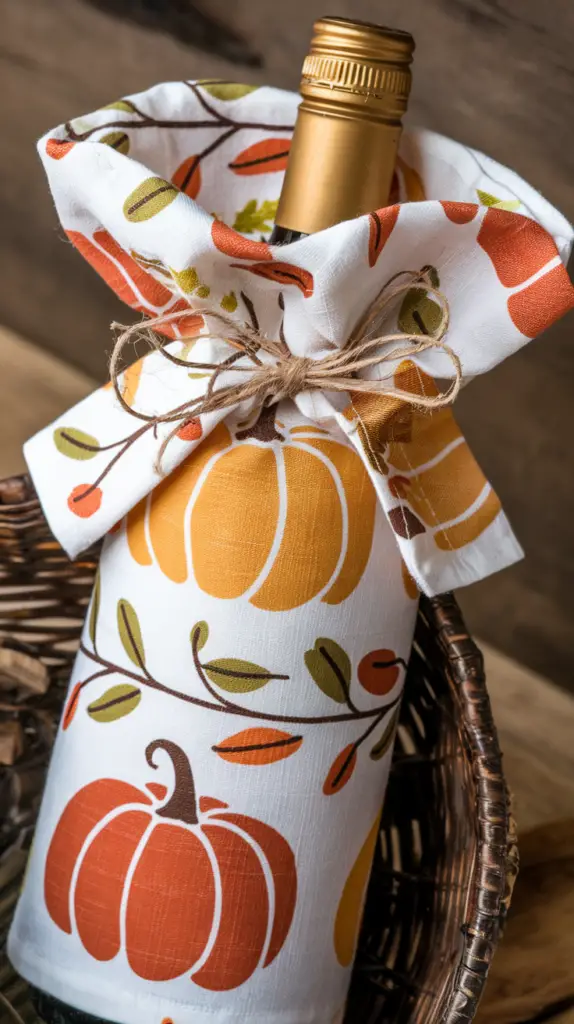Create a DIY wine bottle gift bag using a tea towel. Fold the towel in half, sew or glue the edges, and slide the bottle inside. Tie the top with a ribbon or twine for a charming presentation.