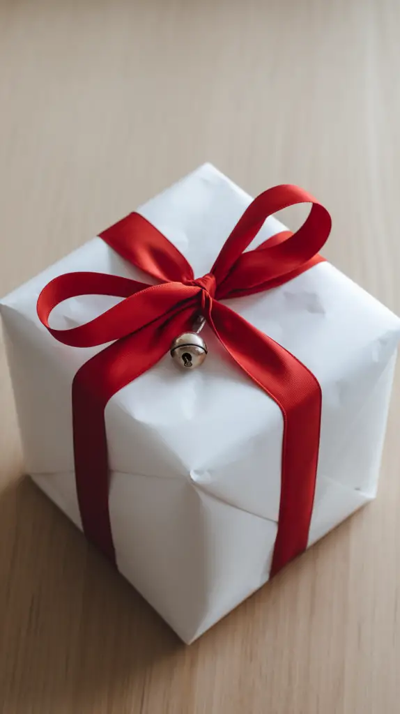 For a classic look, wrap your gift in solid white paper and finish with a bold red ribbon. Add a small bell or candy cane for a festive touch.