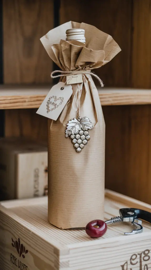 For wine gifts, add decorative charms or tags to the bottle. Use simple wrapping paper or a wine bag and attach a corkscrew or mini ornament for extra flair.
