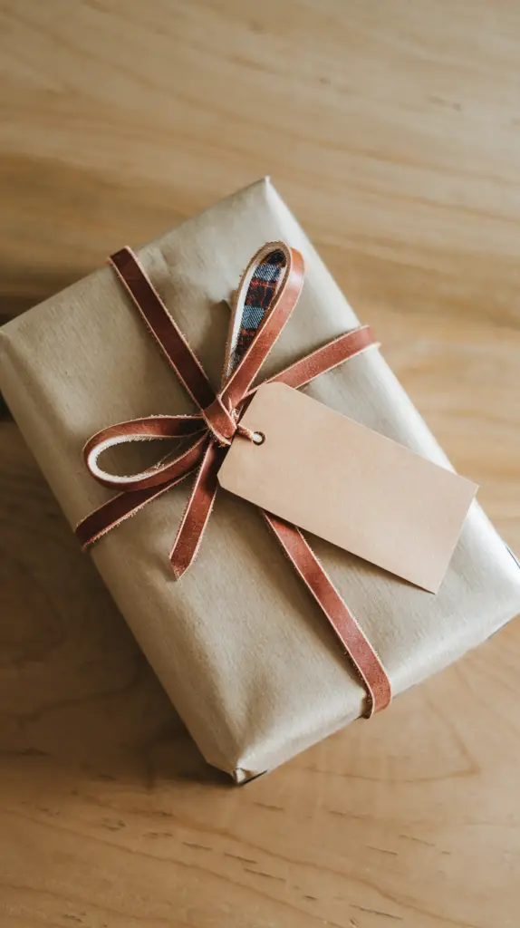 Wrap gifts for him in kraft paper with a leather or plaid ribbon. Add a small tag or vintage-inspired charm to personalize it further.