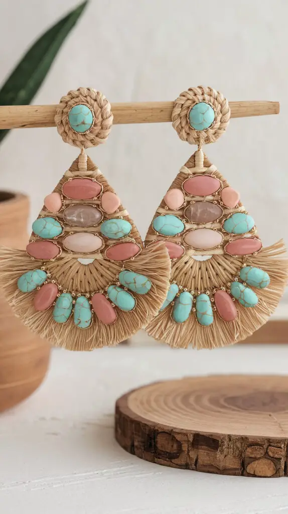 Boho never fully disappears, but in 2025, it’s come back in a quieter, more textured way. I’m seeing earrings made with raffia, woven thread, and semi-precious stones that feel like they could’ve been picked up at a local market on holiday. Instead of over-the-top fringe or oversized hoops, the focus is on natural materials and soft, muted tones—think sandy neutrals, faded coral, and turquoise.