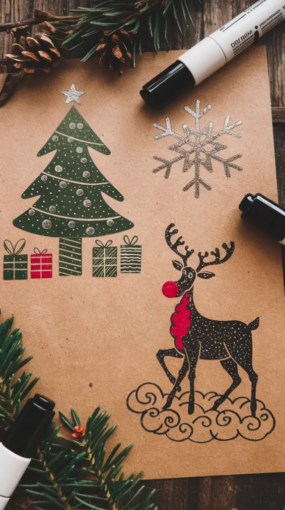 Turn plain kraft paper into an artistic masterpiece by drawing festive illustrations like Christmas trees, reindeer, or snowflakes. Use metallic markers or white paint pens for added elegance. This personalized touch makes your gifts truly one-of-a-kind.