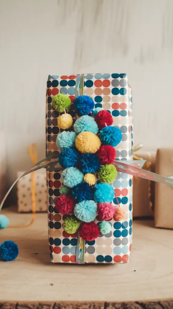 Add a playful touch to your gift wrapping with colorful pom-poms. Attach them to plain or patterned paper using hot glue or string. The cheerful pops of color make this wrapping idea perfect for children or anyone who appreciates whimsical designs.