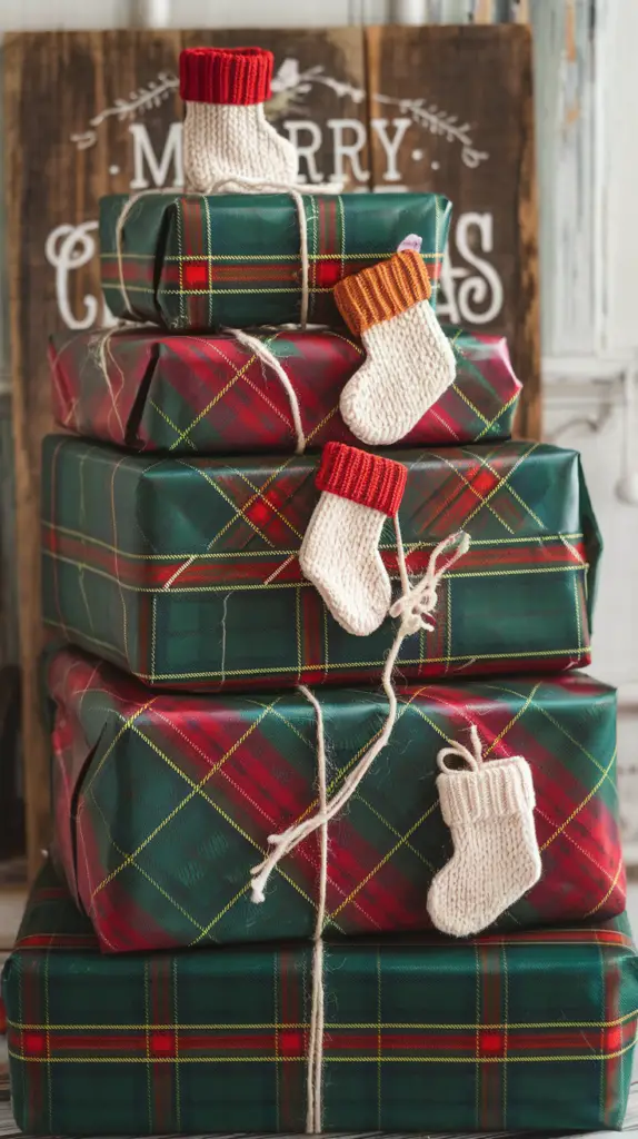 Plaid is a classic winter pattern that exudes coziness and nostalgia. Choose plaid wrapping paper in rich greens, reds, or blues, and tie your gifts with wool yarn instead of traditional ribbon. Add a miniature knit stocking or mitten as a final touch for warmth and charm. This style is perfect for a rustic Christmas aesthetic, making your gifts look as cozy as a warm holiday evening.