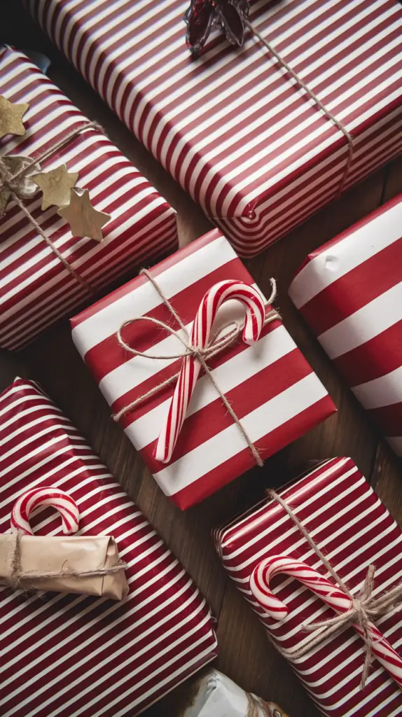 Wrap gifts in red-and-white-striped paper to mimic the look of candy canes. Add real candy canes as decorative accents by tying them to your gift with twine or ribbon. This idea is festive, sweet, and perfect for holiday treats.