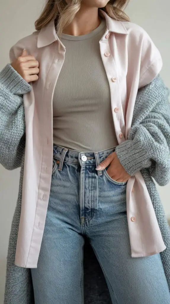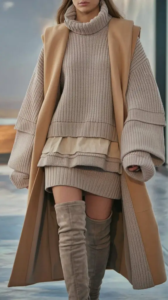 Chunky knits are back (again!) but this year they’re styled with longline vests, maxi cardigans, and over-the-knee boots. It’s a cozy-on-cozy look that layers beautifully without feeling heavy.