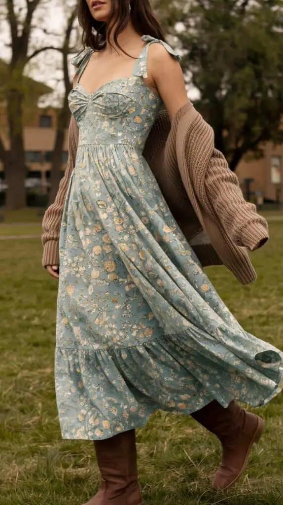 Yes, your summer dresses can come too. In fall 2025, transitional dressing means reworking summer favorites like linen or flowy cotton dresses with tights, boots, and oversized sweaters.