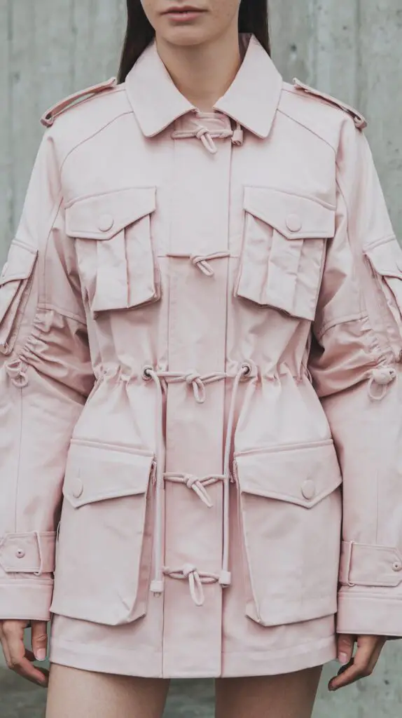 Utility-style jackets with structured pockets, toggles, and drawstrings are everywhere this season, but 2025 versions feature softer silhouettes and more romantic touches. Look for pieces with cinched waists, subtle ruffles, or blush-toned canvas.