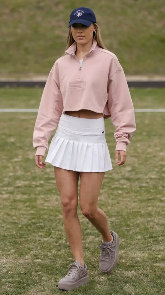 Mix preppy energy with sporty flair by styling a cropped half-zip pullover with a pleated tennis skirt. Choose a clean white skirt for that crisp base and layer with a soft-colored half-zip for a relaxed yet polished vibe. This outfit is perfect for cool morning walks, coffee runs, or casual lunches.