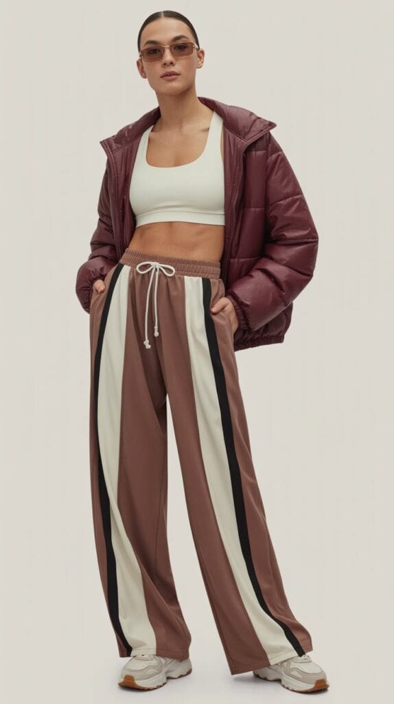 Style it with a cropped puffer or windbreaker for added warmth. Throw on chunky trainers and retro sunnies for an influencer-approved look. This outfit transitions well from workouts to casual events and fits right in with the stylish workout outfits for women trend.
