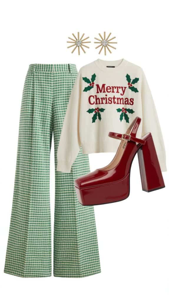 Add a belt to accentuate the waist and throw on a long coat for outdoor events. The neutral palette feels modern but festive — like Christmas morning in fashion form. Finish with gold jewelry or a plaid scarf for a cozy touch.