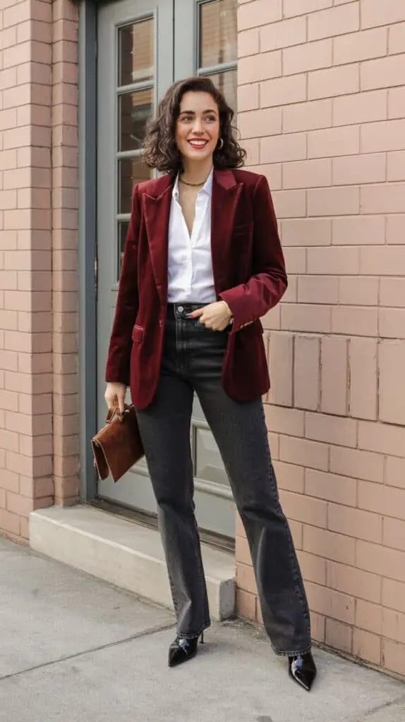 If you love mixing classic with casual, this one’s for you. A velvet blazer instantly elevates a simple outfit — pair it with dark denim, a tucked-in blouse, and pointed boots.