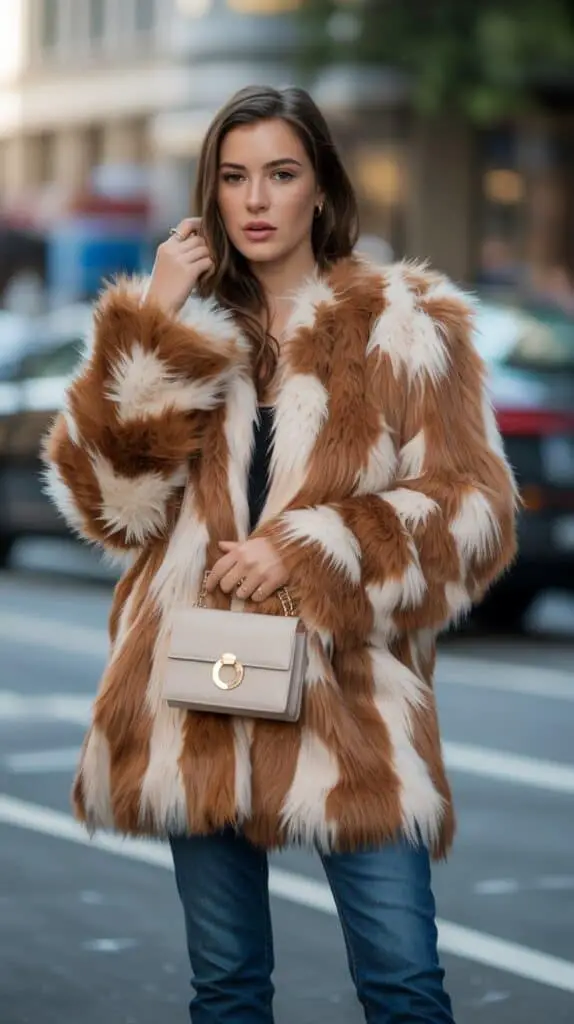 Winter outerwear gets playful this year. Think fluffy faux fur coats in caramel, ivory, or deep berry shades paired with small structured handbags.
