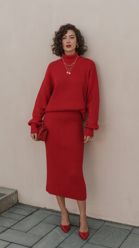 Matching sets in bold red tones are everywhere this Christmas season. Try a ribbed knit skirt and sweater combo with gold jewelry and soft curls for a romantic, festive feel.