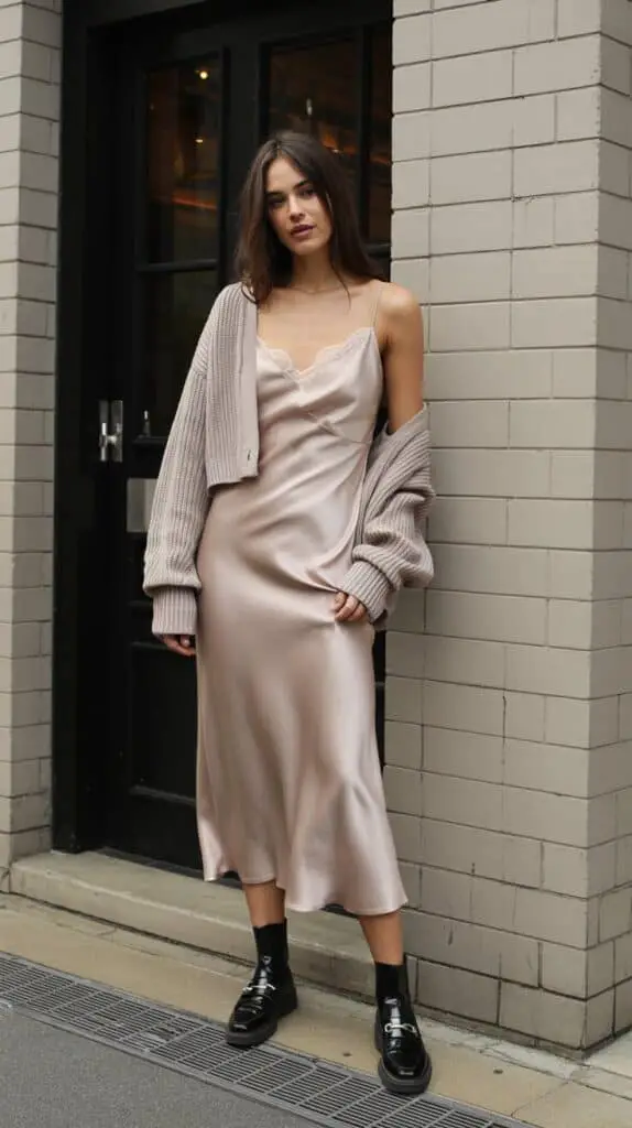 If you love feminine silhouettes but still want warmth, layer a soft cropped sweater or cardigan over a satin slip dress.