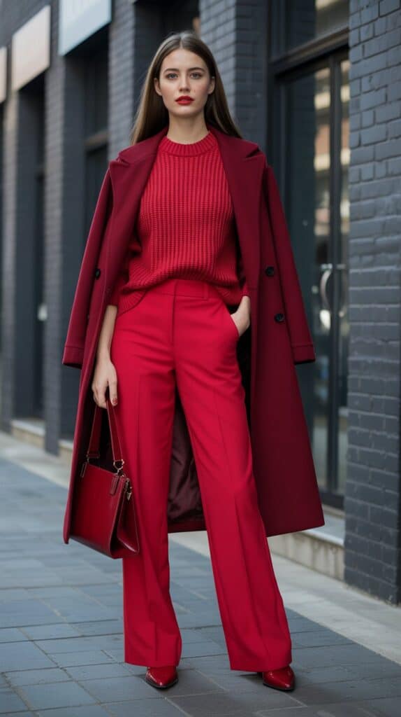 If subtlety isn’t your thing, go full red. Layer different shades — cherry, burgundy, wine — for dimension. Think red trousers with a darker sweater, or a crimson dress with a berry coat.