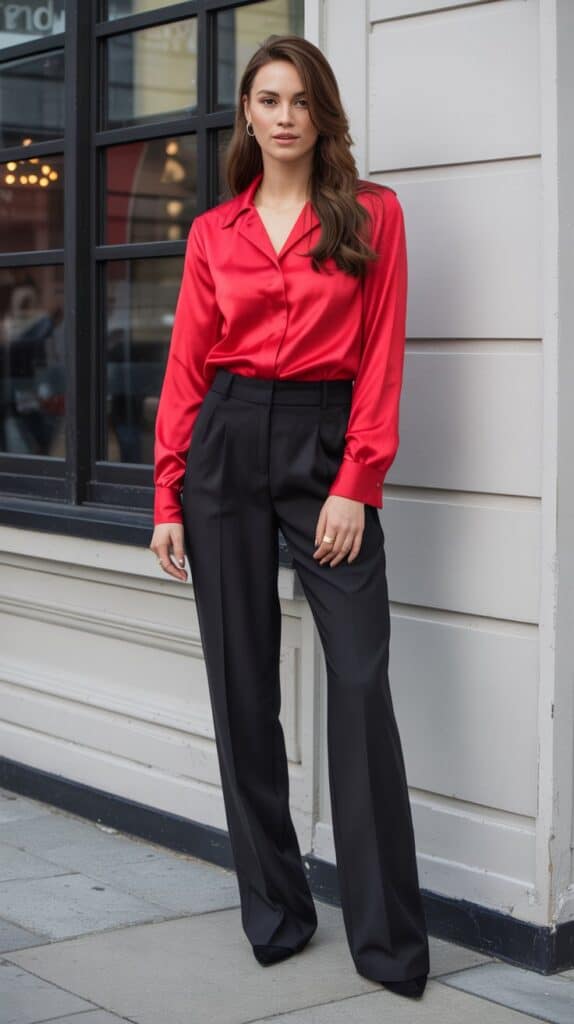 The red blouse trend this year leans more polished than playful. Opt for a silky satin or lightweight fabric that drapes beautifully. Pair it with black tailored trousers or high-waisted wide-leg pants.