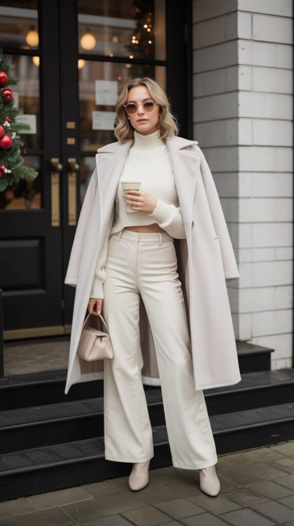 All-white Christmas looks are trending hard this year. Monochrome outfits in shades of ivory, cream, or soft snow white feel elegant and modern. Try a white knit skirt with a fuzzy cropped sweater, or wide-leg pants with a tailored coat.