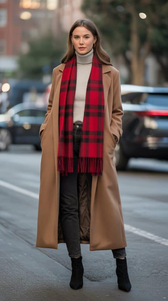 For those spending Christmas outdoors, layering is everything. A tailored longline coat in camel, red, or charcoal paired with a bold printed scarf feels elegant and intentional.