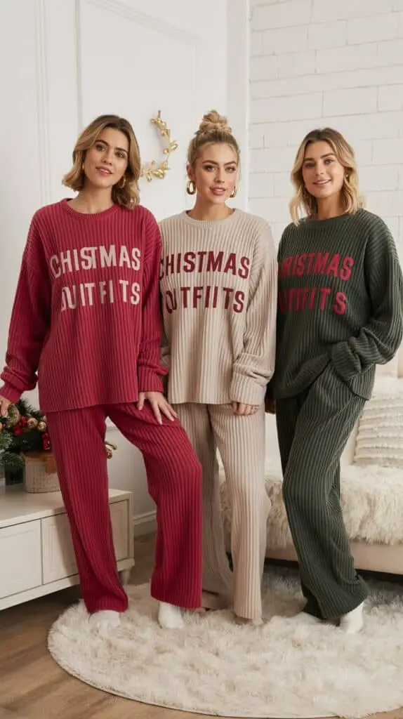 Choose sets in soft reds, oatmeal, or even dark green. Add fuzzy socks, gold earrings, and a messy bun — suddenly you’re comfy and camera-ready.
