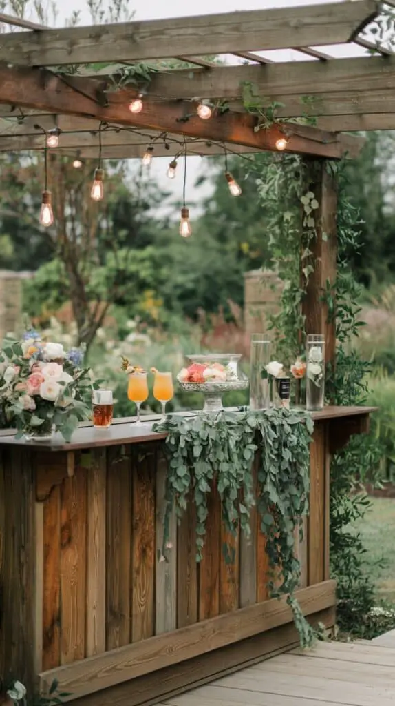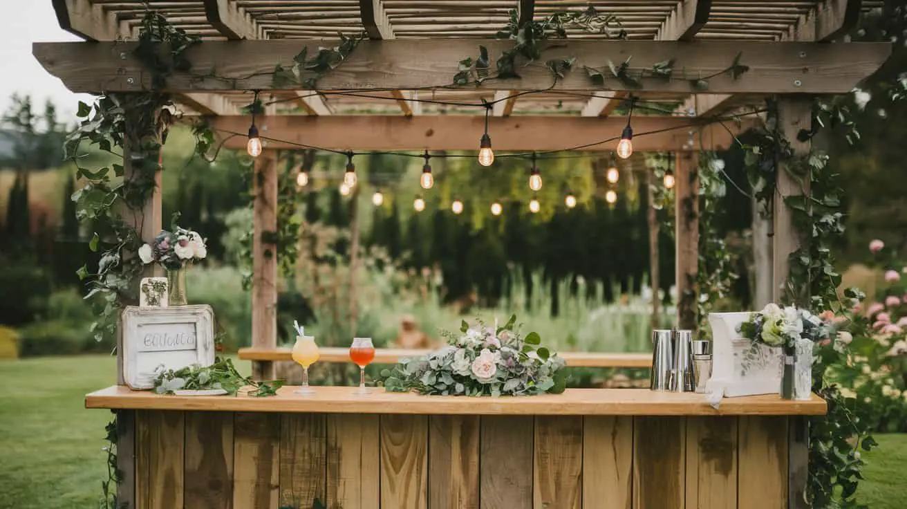Use a basic long wooden bar under a pergola or hanging archway. Decorate with overhead string lights, ivy, or florals. Keep the menu simple—maybe just two cocktails and a mocktail—and let the ambiance do the talking.