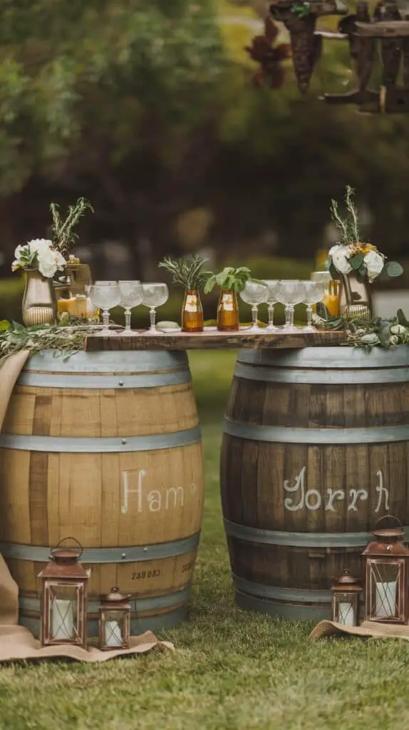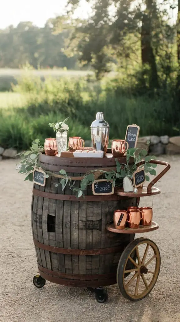 Convert an old whiskey barrel into a small rolling bar cart. Add copper mugs, cocktail shakers, and mini chalkboard labels for a warm, industrial-meets-rustic look. Use it for Moscow Mules, Old Fashioneds, or any classic cocktails that suit your bar aesthetic wedding vibe.