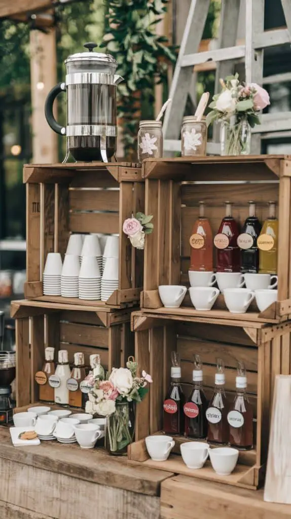 Stack wooden crates to make shelves for coffee cups, syrups, and mix-ins. Add a large coffee urn or French press setup on top. Decorate with small floral jars and vintage spoons. This works beautifully for brunch weddings or as a cozy bar late into the night.