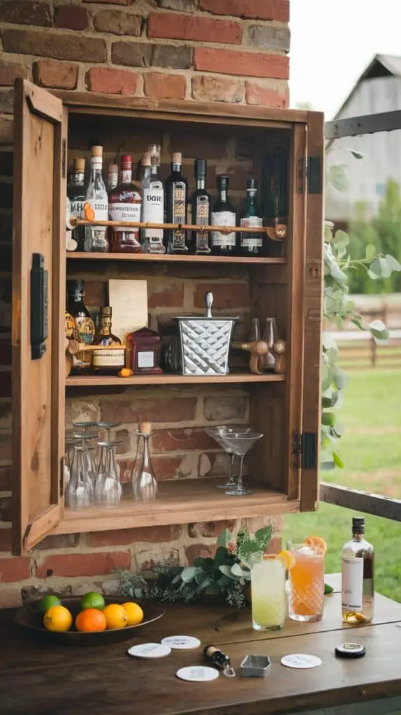Repurpose a freestanding bar cabinet outdoors. Fill it with spirits, bitters, and garnishes for a modern-rustic mix. This idea works well if your wedding venue has a sheltered corner or barn wall where the cabinet can tuck in and look intentional.