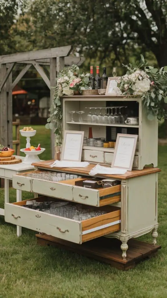 Take an old dresser, remove a few drawers, and turn them into open storage for glasses and supplies. Style the top with bottles, framed menus, or even floral arrangements. This bar works beautifully for garden weddings or venues with a vintage aesthetic.