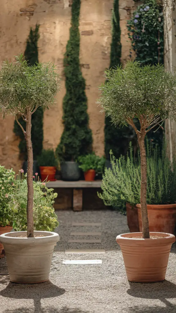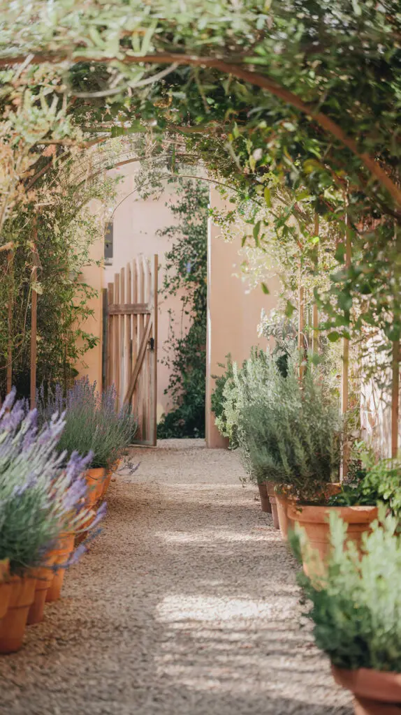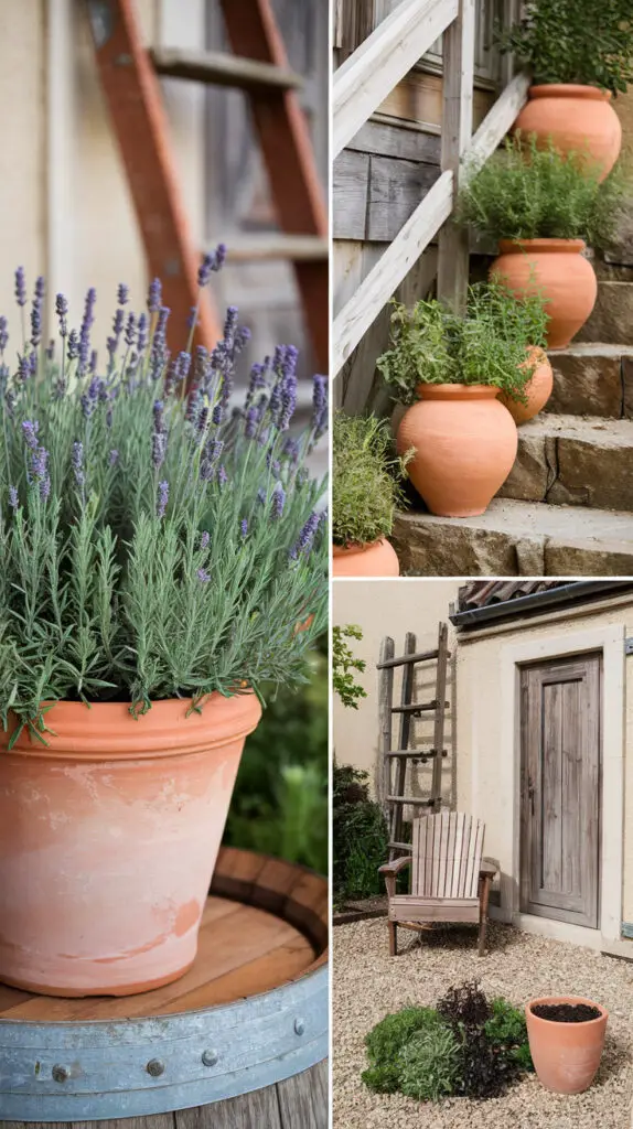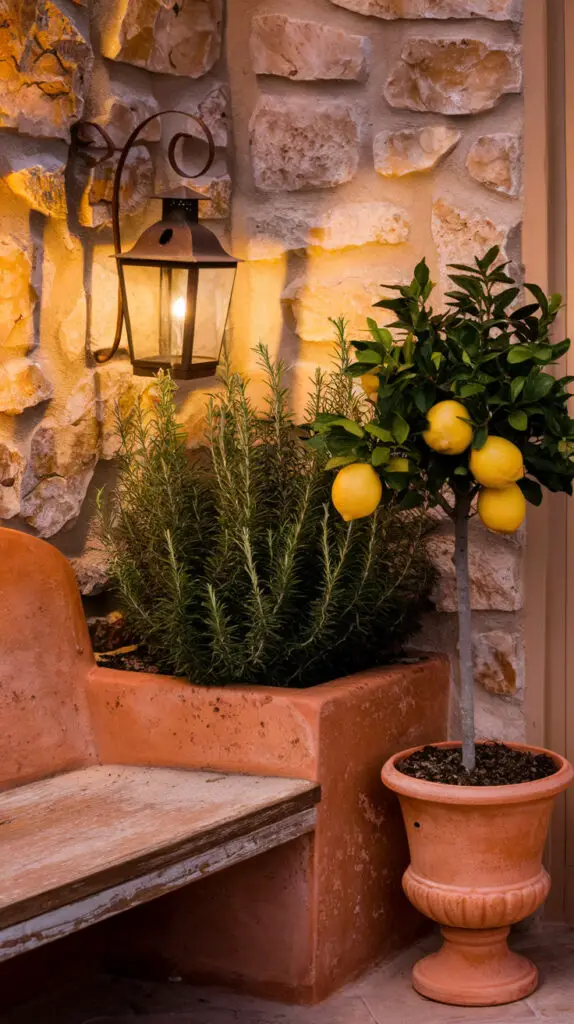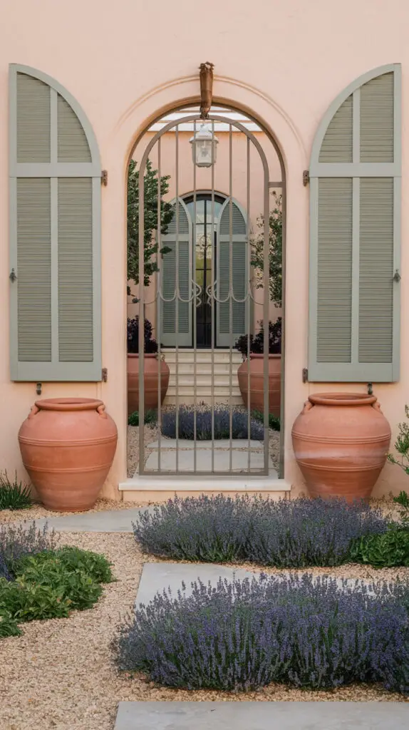 The good news is you don’t need a big garden bed. A few clusters of lavender, sage, or oregano in aged-looking clay pots give you that soft Mediterranean garden look without digging anything up. Bonus: it smells amazing every time you brush past.
