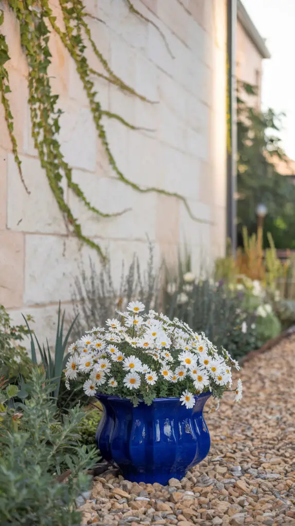 That rich Mediterranean blue pops beautifully against neutral stone and gravel. Even one or two glazed ceramic planters or a painted tile on the wall can bring in that coastal feel. Use sparingly and it adds just enough color to keep things cheerful.