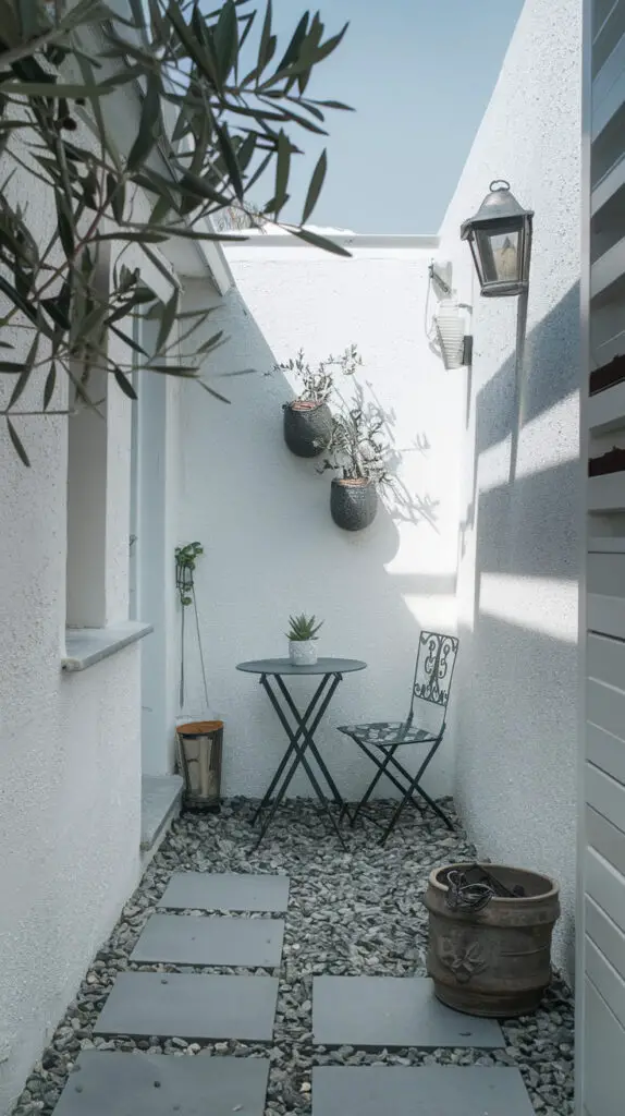 Even a basic concrete patio can turn into a Mediterranean courtyard garden with a few changes. Add a folding bistro table, a wall-mounted planter with trailing ivy, and a couple of woven cushions. If you have a corner, use a tall clay pot with a lemon tree or oleander to anchor the space.