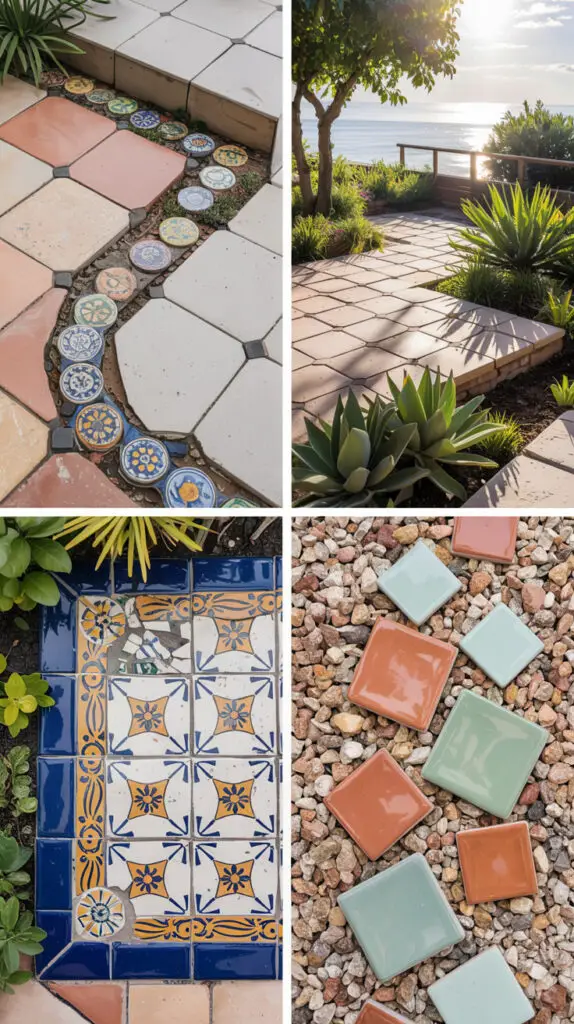 This might be one of my favorite Mediterranean backyard ideas. You can often find leftover tiles at hardware stores or reuse broken ones for a mosaic edge. Line a garden bed or patio border with colorful tile pieces—it feels like something straight out of a Spanish garden, and it’s usually free or super cheap.