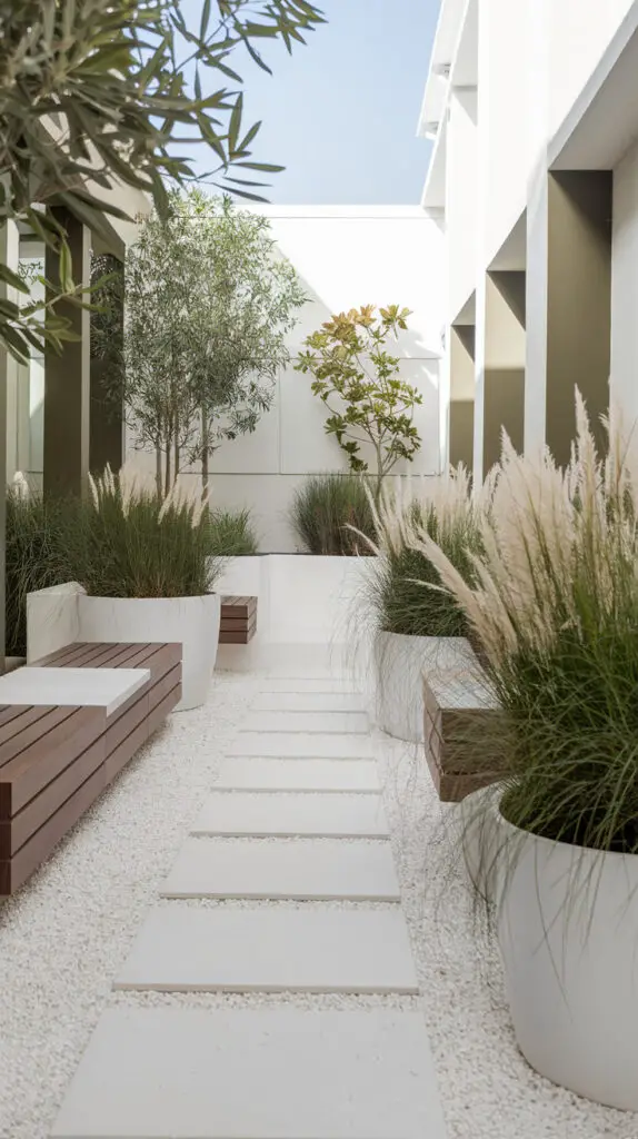 For a more clean-lined, updated vibe, go modern Mediterranean with simple wooden benches, whitewashed planters, and neutral gravel or pavers. Add tall grasses or olive-toned plants and keep the color palette minimal. It still feels coastal and warm but a little more curated.