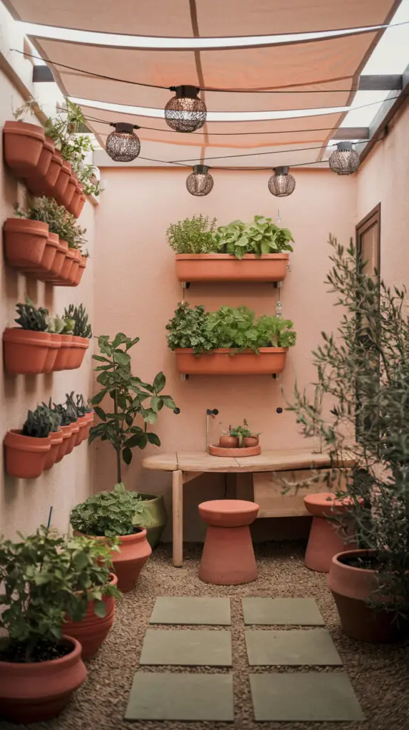 If your space is truly tiny, think vertical. Hang small terra cotta pots on a wall or fence, use shelves to layer different herbs, and keep the ground clear with pea gravel or stepping stones. A few solar lanterns or fairy lights go a long way here too.