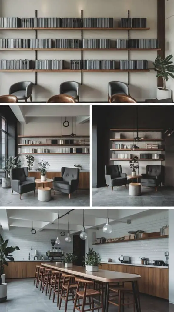 If vintage isn’t your style, a modern library coffee shop can still exude coziness. Start with clean lines, minimalist shelving, and modular kitchen furniture that doubles as display space. Keep the palette moody but neutral: slate, walnut, and creamy whites.