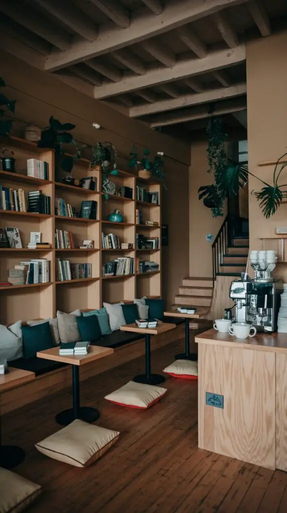 Japandi interiors, blending Japanese restraint with Scandinavian warmth, are perfect for a modern bookshop cafe interior design. Imagine light oak shelving, low benches with cushions, and plenty of greenery to soften the lines.