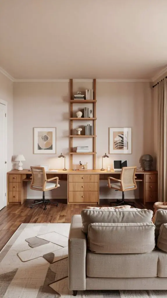 To keep things harmonious, match the desk finishes and chairs, then add shared shelving or drawers in between. It makes the space more functional while still feeling part of your living room decor.