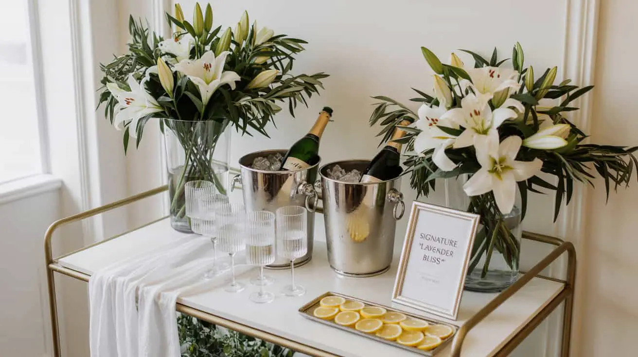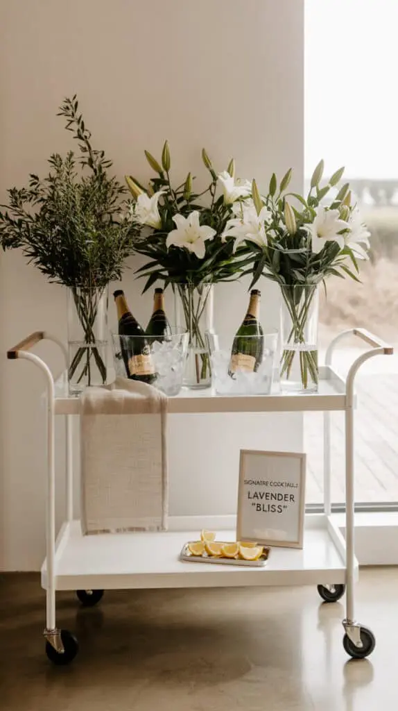 Perfect for a cocktail party wedding where guests roam and mingle, this setup uses a sleek white bar cart or narrow table on wheels. Behind it, tall glass vases hold long-stem florals—think lilies, olive branches, or even foraged greens—and clear ice buckets keep the champagne, wine, and soda water chilled and ready.