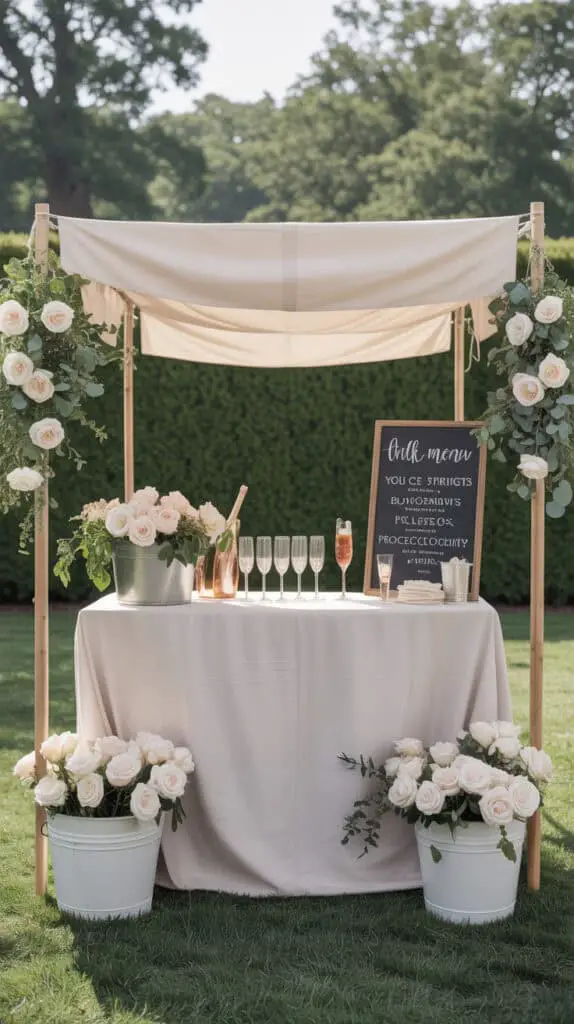 For a wedding that leans soft and floral, this cocktail bar design feels like a natural extension of the ceremony. A simple white linen-covered table sits beneath a lightweight cream canopy (you can DIY this with fabric and two garden posts).