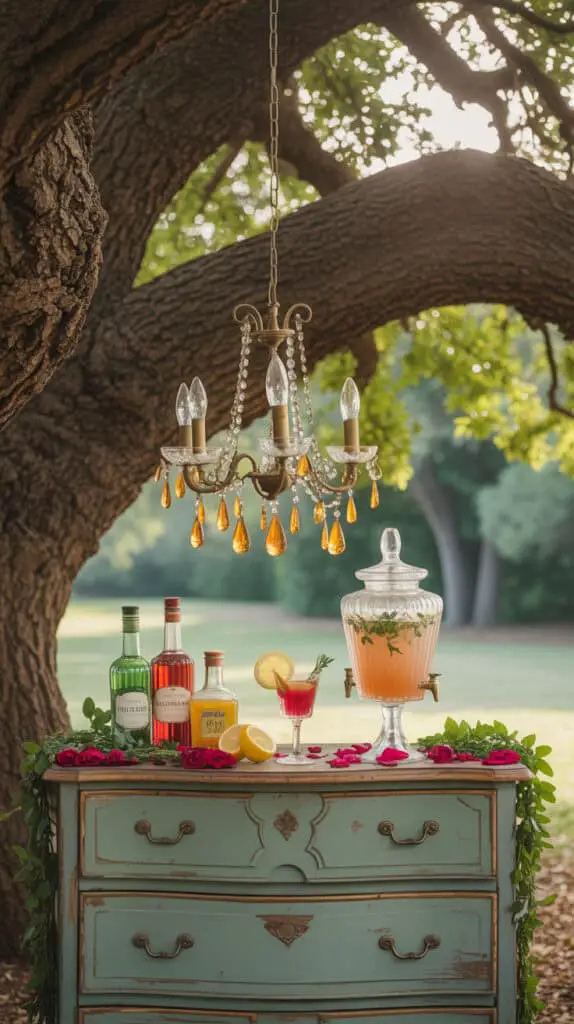 This idea starts with an old dresser—painted, distressed, or pulled from a thrift shop. Set it under a tree with strong branches, and hang a vintage-style chandelier (battery-operated or solar-powered ones exist!) from above.