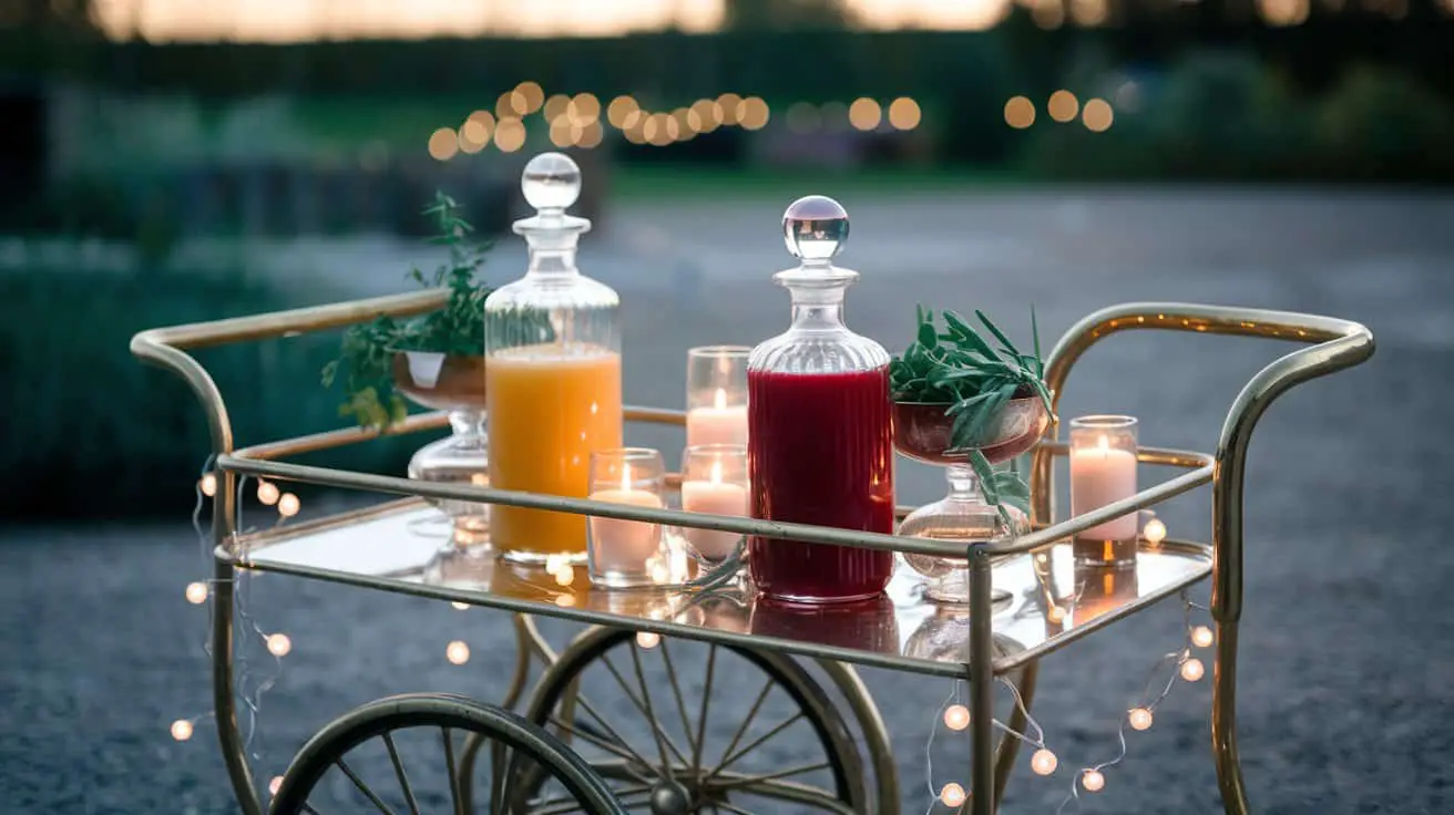Keep things minimal and romantic with a vintage metal cart in aged silver or brass. Add two or three carefully chosen juices—like blackberry mint, blood orange, or cucumber lime—and serve them in clear glass decanters. Tuck candles or votives into the corners, and place a few bowls of sliced fruits or herbs nearby.