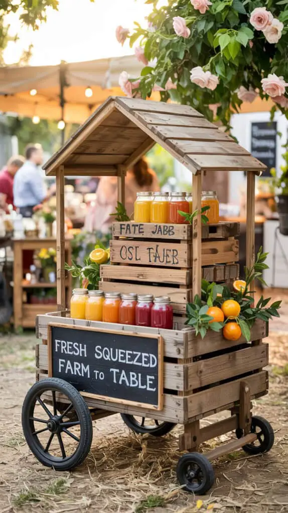 Repurpose a small house bar cart with wheels for a fun, layered display. Use stacked wooden crates for height and serve juices from ceramic pitchers or mason jars. Decorate with rustic signage, citrus sprigs, and vintage juice glasses.