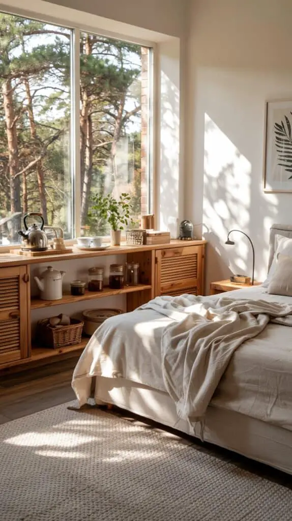 Imagine waking up in a bedroom with a wall-sized window overlooking a pine forest. Light streams in across pale oak floors, a low upholstered bed, and linen curtains. Here, a home coffee station blends seamlessly with the setting by using natural materials—think a compact wooden cabinet topped with a matte-black kettle, ceramic mugs, and a few jars of loose-leaf tea.