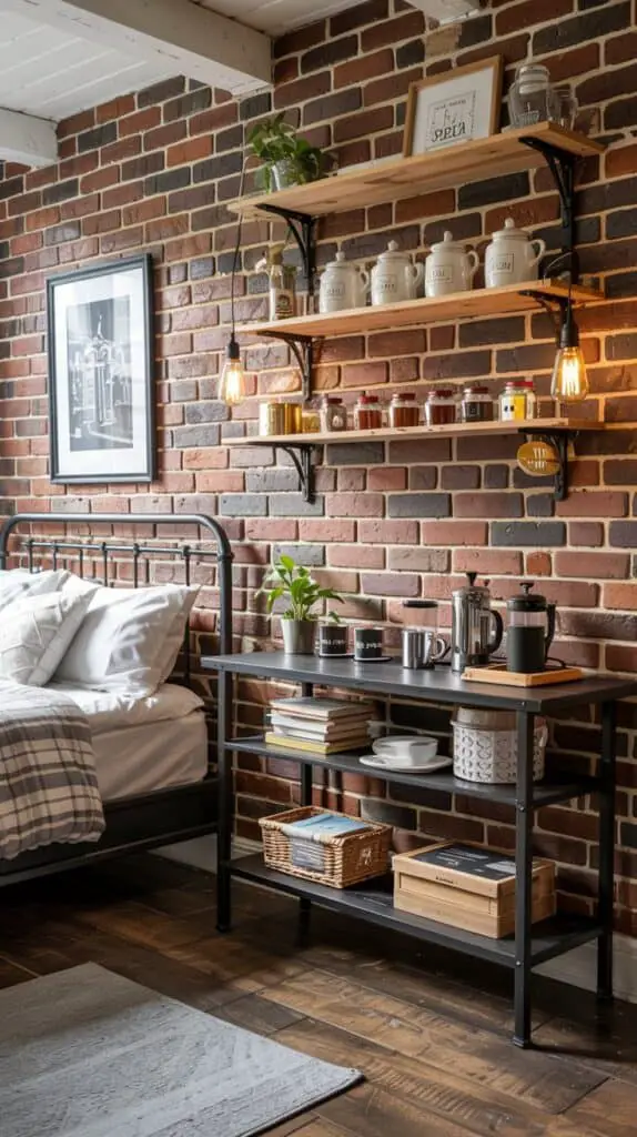 Think exposed brick walls, metal-framed bed, and dark hardwood floors. In this setup, a coffee bar in bedroom spaces can lean into industrial coffee corner kitchen style. Repurpose a narrow metal console table with black steel legs and reclaimed wood top. On it, place a French press, grinder, and storage canisters for beans.