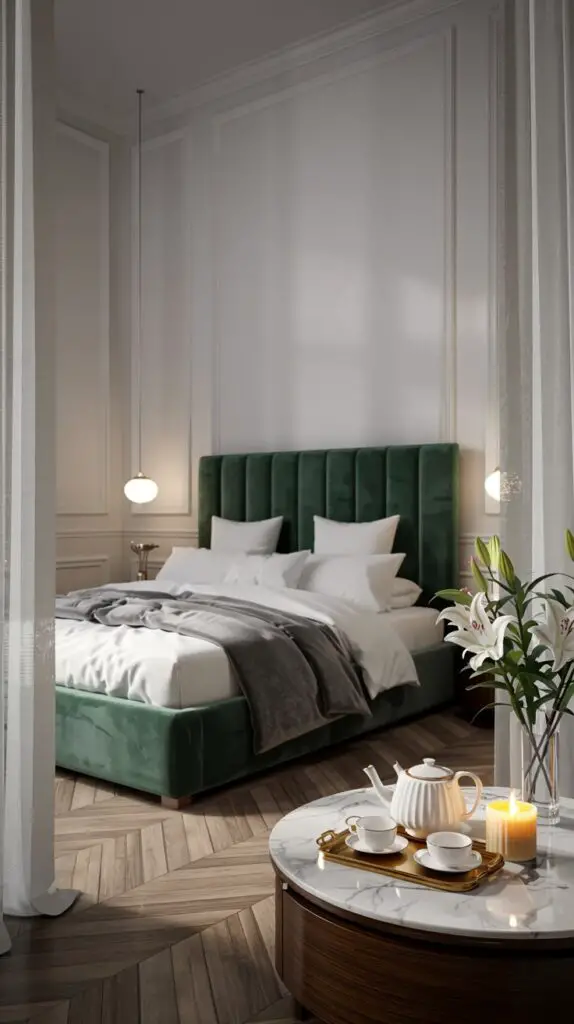 For those who prefer tea over coffee, a tea cabinet in a soft, modern bedroom creates a calming vibe. Picture a bedroom with herringbone wood floors, tall white walls, and a plush velvet bedframe. Against one wall, a sleek cabinet serves as your tea nook: inside are baskets of teas, while the top holds a teapot, electric kettle, and cups on a marble tray.