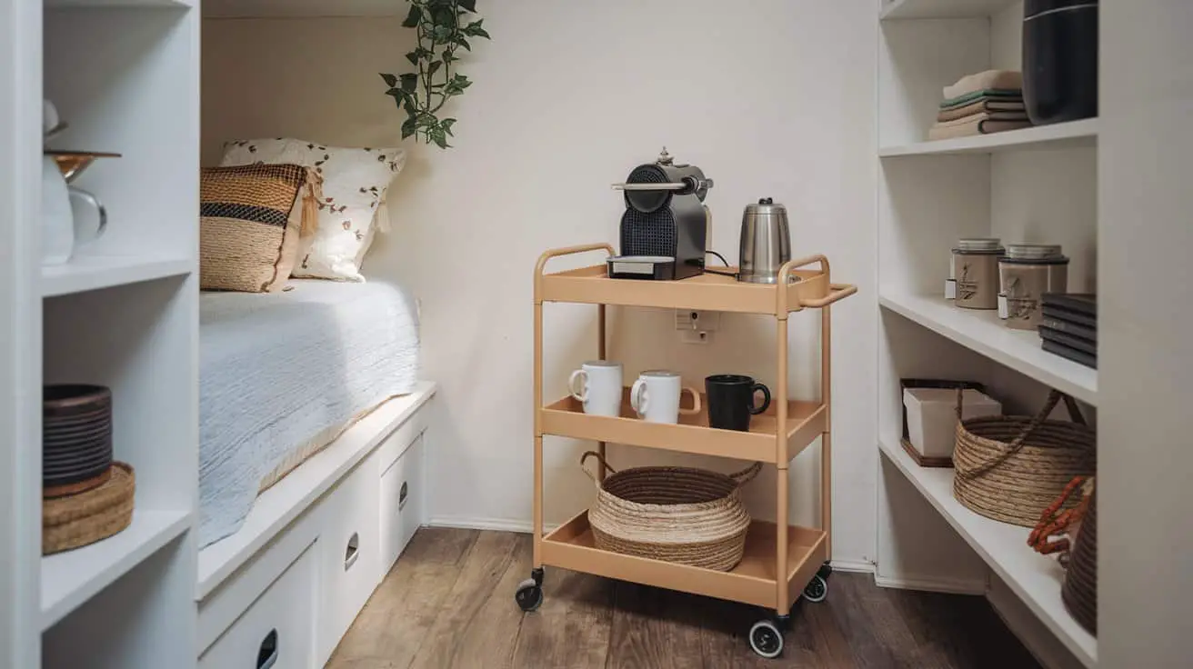 In smaller apartments, a mini coffee station can work wonders. Imagine a narrow bedroom with laminate floors, a bed tucked against one wall, and modern built-ins. A slim rolling cart sits in the corner, topped with a compact espresso machine, milk frother, and mugs.