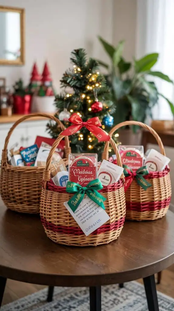 It looks sweet and warm without costing much. You can add shredded kraft paper for texture or tuck in a sprig of pine for that Christmas-morning feeling. This is the type of basket that feels personal even when it’s simple, and it works perfectly for colleagues, teachers, or friends you don’t want to overspend on.