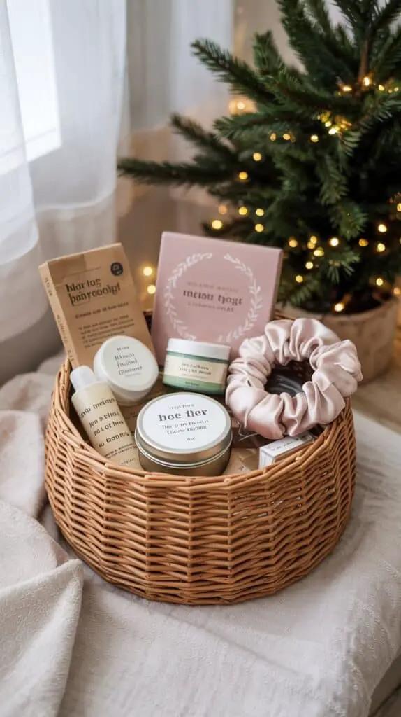 This basket is perfect for friends who love cosy routines—or honestly, anyone who’s exhausted by December (so… everyone). Use a small tin, a ceramic bowl, or a tiny wicker basket. Add a mini lotion, a small candle, a sample-size scrub, maybe a satin scrunchie or under-eye patch.