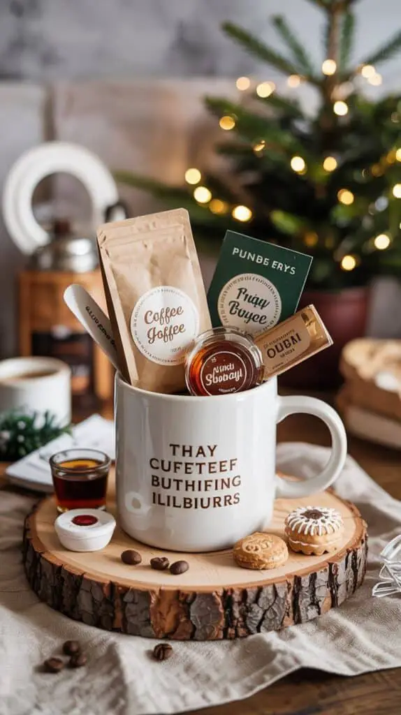 If you want something that feels both festive and useful, this is it. Add a small bag of coffee grounds or a couple tea sachets, a mini syrup, a teaspoon, or a tiny honey jar. You can even add a small Christmas biscuit for an extra treat.